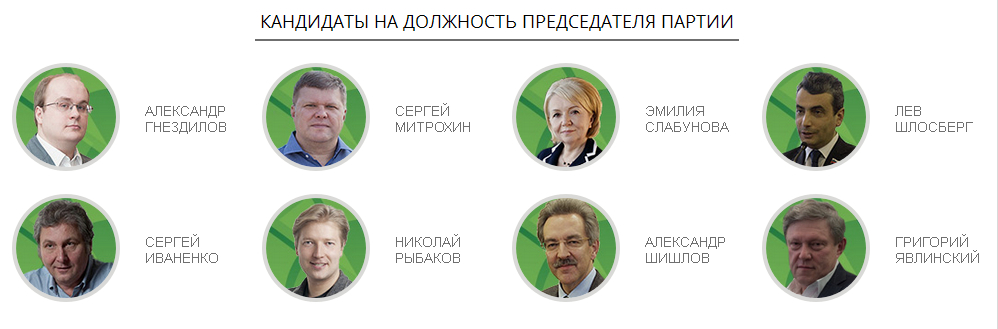 Александр ГНЕЗДИЛОВ, Николай РЫБАКОВ, Эмилия СЛАБУНОВА, Александр ШИШЛОВ - на мой взгляд, пока еще не обладают необходимым уровнем популярности среди наших сторонников, чтобы возглавить партию на этом Съезде. Но я поддерживаю их выдвижение - партия сильна новыми лицами, а конкуренция - это всегда хорошо.