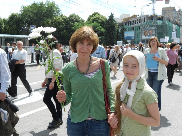 Лица участников шествия. Попросил разрешения сделать это фото и получил его. Может быть потому, что на плечах у меня висел «яблочный» флаг, завязанный узлом на груди и скреплённый значком «Свободу узникам 6 мая!». С белыми цветами в руках за свободу. Вспомнилось Белое Движение. А повязанный у девочки платок напомнил прихожанок Церкви, фразу из одних воспоминаний о Гражданской войне, когда вступающие части Вооружённых Сил Юга России встречались в освобождённых от красных городах колокольным звоном.