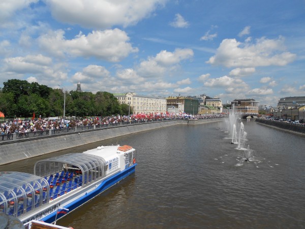 Взгляд с Лужкова моста, соединяющего Болотную площадь и Кадашевскую набережную. Колонна уходит вдаль. Шествие 12 июня 2013 года стало историей.