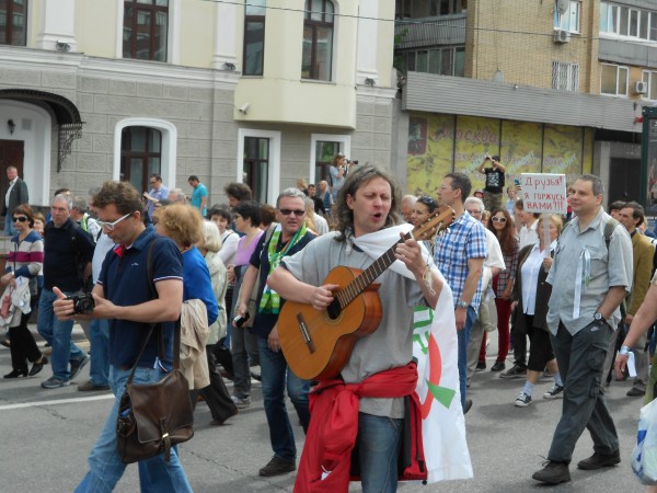 Для меня открытием сегодняшнего дня был вот этот «яблочник», плечи которого были обняты нашим партийным флагом. Наш бард задавал темп «яблочной» колонне, распевая такие вот лозунги: «Пу-у-утин должен уйти, хэй-хэй! Явлинский должен прийти, хэй-хэй!», «Собя-я-янин должен уйти, хэй-хэй! Митрохин должен прийти, хэй-хэй!». Он же пел Высоцкого, Окуджаву. Люди с интересом слушали и присоединялись, шли по бокам колонны «ЯБЛОКА». А когда вышли на Болотную площадь, раздалось: «Нам дворцов заманчивые своды не заменят никогда свободы …» Это и есть главный «яблочный» лозунг.