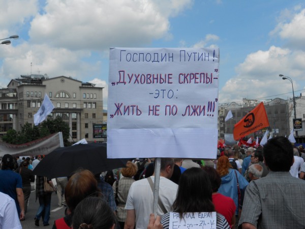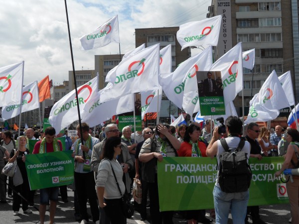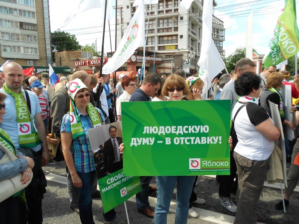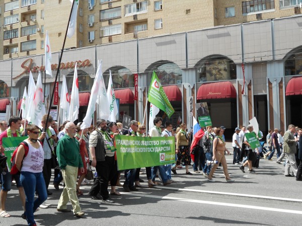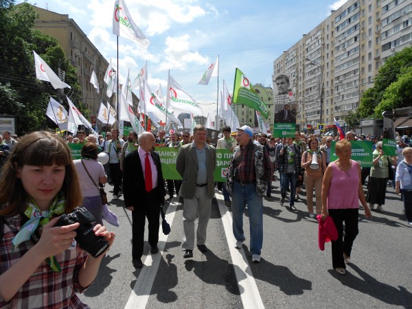 Шествие было не таким плотным как предыдущее, состоявшееся 6 мая 2012 года. Людей было намного меньше. Но это было, без сомнений, не собрание активистов различных партий и организаций, к шествию присоединилось много обычных горожан. «Яблочная» колонна неторопливо катится по Якиманке.