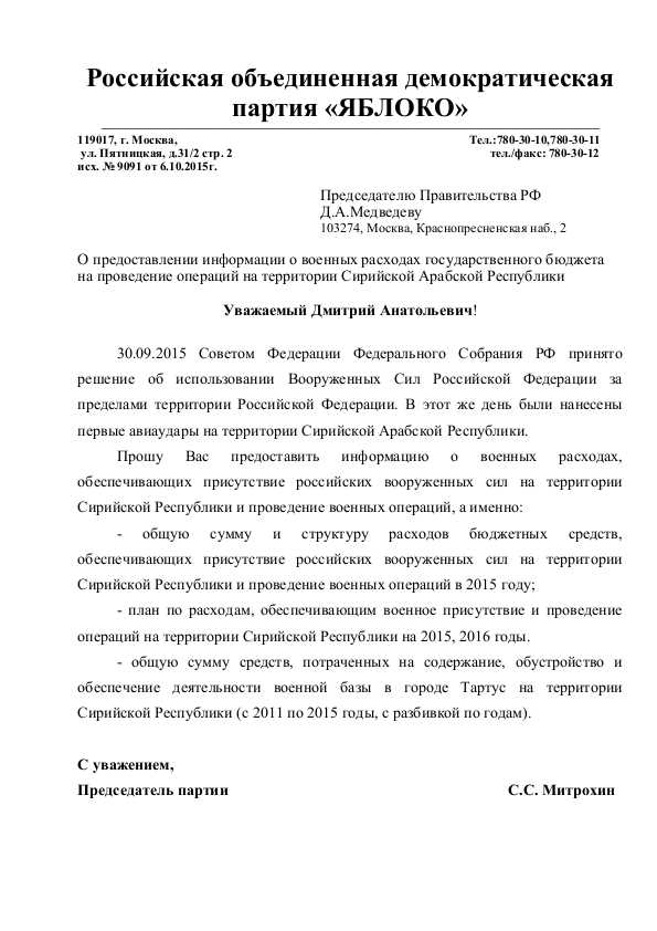 Ниже опубликовано обращение Председателя РОДП «ЯБЛОКО» главе российского Правительство Д.А. Медведева, 6 октября 2015 года.