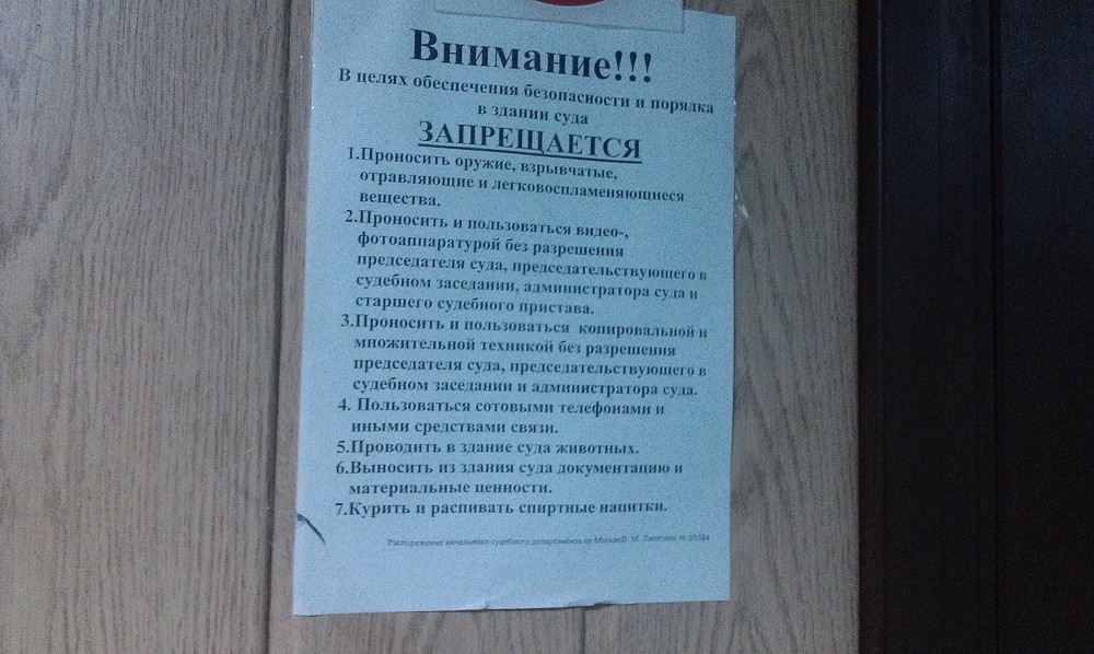На первом этаже – неработающий информационный терминал. Гардероба в здании суда нет. Зато имеется грозная бумаженция за подписью бывшего руководителя Управления Судебного Департамента некоего Лепезина. Грозный и, по-видимому, не очень знающий законодательство Лепезин пишет: в суде по телефону разговаривать нельзя, пользоваться множительной техникой без разрешения судьи нельзя. Наверное, Лепезин запретил бы еще и дышать в здании суда, однако все кончается. Кончился и место на листе бумаги. Ворюга Лепезин, укравший 300 миллионов рублей, выделенных на судебных переводчиков, уже давно является фигурантом по уголовному делу, а его бредовые указания все еще украшают стены суда.