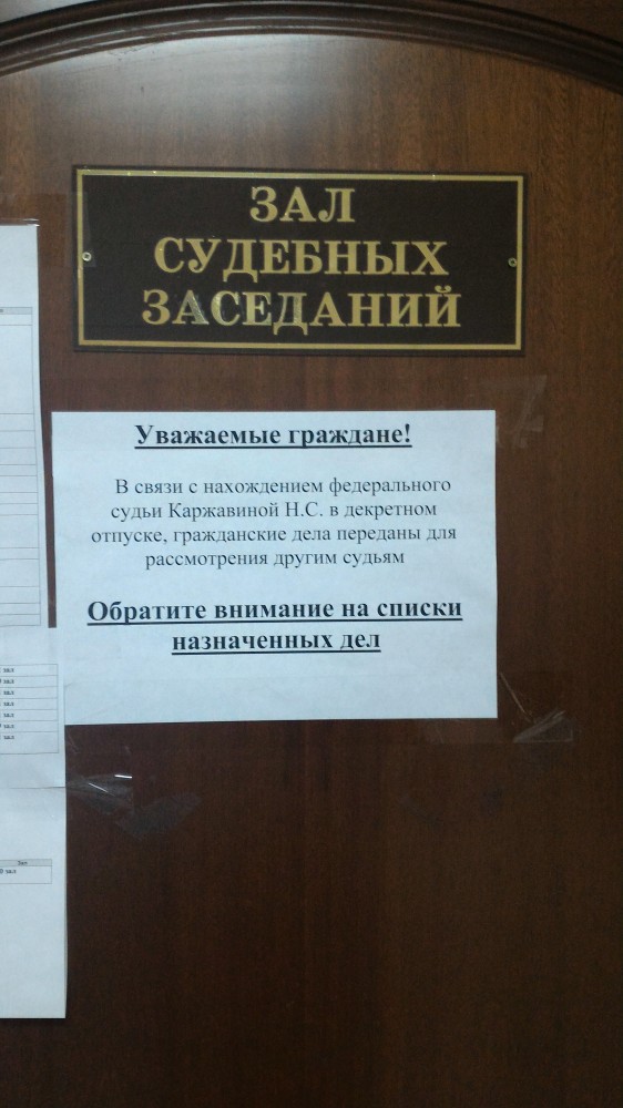 Обнаруживаю, что на двери в зал, где творит правосудие судья Д. Долгополов, отсутствует расписание дел. Что слушает судья, кого судит, когда слушается следующее дело? – непонятно.