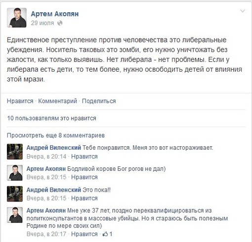 «Единственое преступление против человечества это либеральные убеждения. Носитель таковых это зомби, его нужно уничтожать без жалости, как только выявишь. Нет либерала - нет проблемы. Если у либерала есть дети, то тем более, нужно освободить детей от влияния этой мрази».