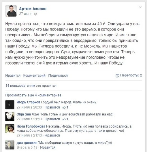 «Нужно признаться, что немцы отомстили нам за 45-й. Они украли у нас Победу. Потому что мы победили не это дерьмо, в которое они превратились. Мы победили самую крутую нацию в мире. И им стало так обидно, что они превратились в евродерьмо, только бы принизить нашу Победу. Мы Гитлера победили, а не Меркель. Мы нацистов победили, а не европидоров. Суки, сумрачные немецкие геи. Теперь нам нужно уничтожить это недоразумение поголовно, чтобы не позорили тевтонский дух и германскую ярость. И нашу Победу».