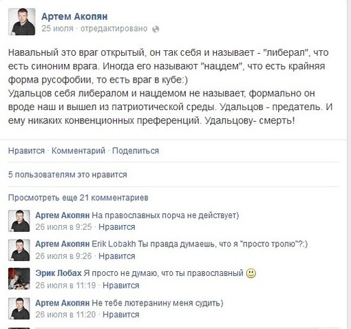 «Навальный это враг открытый, он так себя и называет - "либерал", что есть синоним врага. Иногда его называют "нацдем", что есть крайняя форма русофобии, то есть враг в кубе:) Удальцов себя либералом и нацдемом не называет, формально он вроде наш и вышел из патриотической среды. Удальцов - предатель. И ему никаких конвенционных преференций. Удальцову- смерть!».
