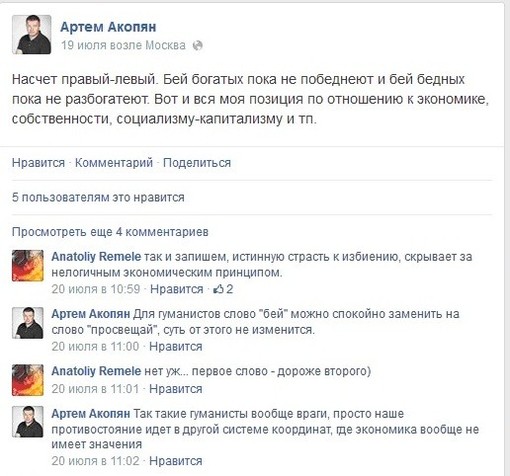 «Насчет правый-левый. Бей богатых пока не победнеют и бей бедных пока не разбогатеют. Вот и вся моя позиция по отношению к экономике, собственности, социализму-капитализму и тп.»