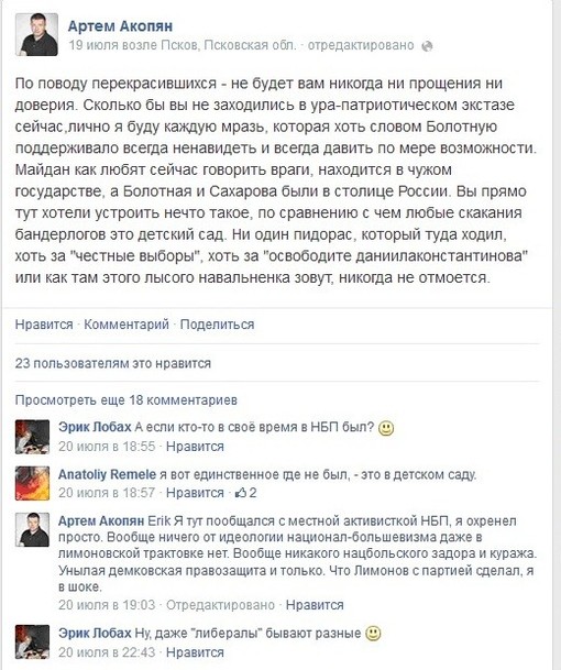 «По поводу перекрасившихся - не будет вам никогда ни прощения ни доверия. Сколько бы вы не заходились в ура-патриотическом экстазе сейчас,лично я буду каждую мразь, которая хоть словом Болотную поддерживало всегда ненавидеть и всегда давить по мере возможности. Майдан как любят сейчас говорить враги, находится в чужом государстве, а Болотная и Сахарова были в столице России. Вы прямо тут хотели устроить нечто такое, по сравнению с чем любые скакания бандерлогов это детский сад. Ни один пидорас, который туда ходил, хоть за "честные выборы", хоть за "освободите даниилаконстантинова" или как там этого лысого навальненка зовут, никогда не отмоется».