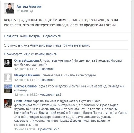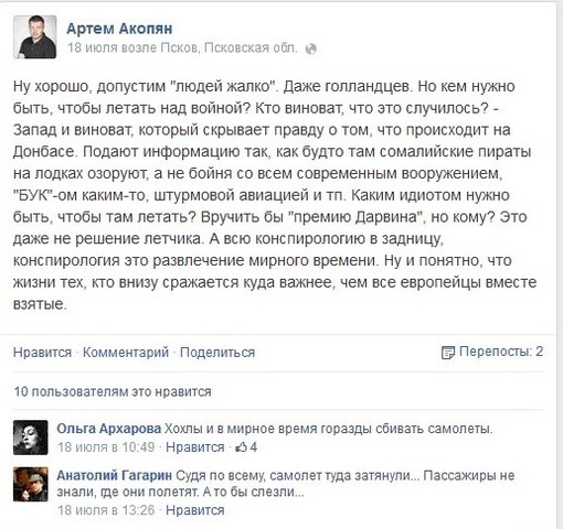 «Ну хорошо, допустим "людей жалко". Даже голландцев. Но кем нужно быть, чтобы летать над войной? Кто виноват, что это случилось? - Запад и виноват, который скрывает правду о том, что происходит на Донбасе. Подают информацию так, как будто там сомалийские пираты на лодках озоруют, а не бойня со всем современным вооружением, "БУК"-ом каким-то, штурмовой авиацией и тп. Каким идиотом нужно быть, чтобы там летать? Вручить бы "премию Дарвина", но кому? Это даже не решение летчика. А всю конспирологию в задницу, конспирология это развлечение мирного времени. Ну и понятно, что жизни тех, кто внизу сражается куда важнее, чем все европейцы вместе взятые».