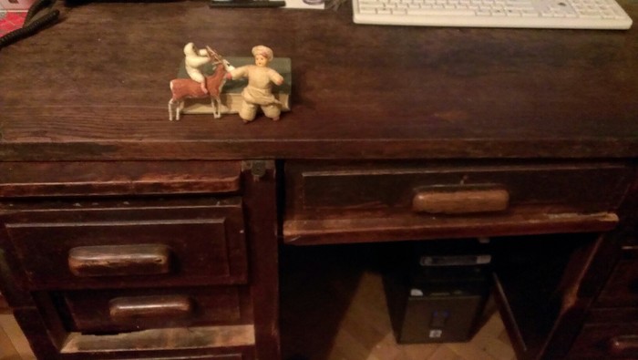 Письменный стол, которому больше ста лет, перешедший ко мне от деда — он чудом сохранился во время блокады, а не сгорел в печке во время лютых морозов. Когда-то, маленьким, я строил на этом столе крепости из книг, и населял их оловянными солдатиками. Теперь, вот уже почти сорок лет, я работаю за этим столом, категорически отказываясь менять его на новый.