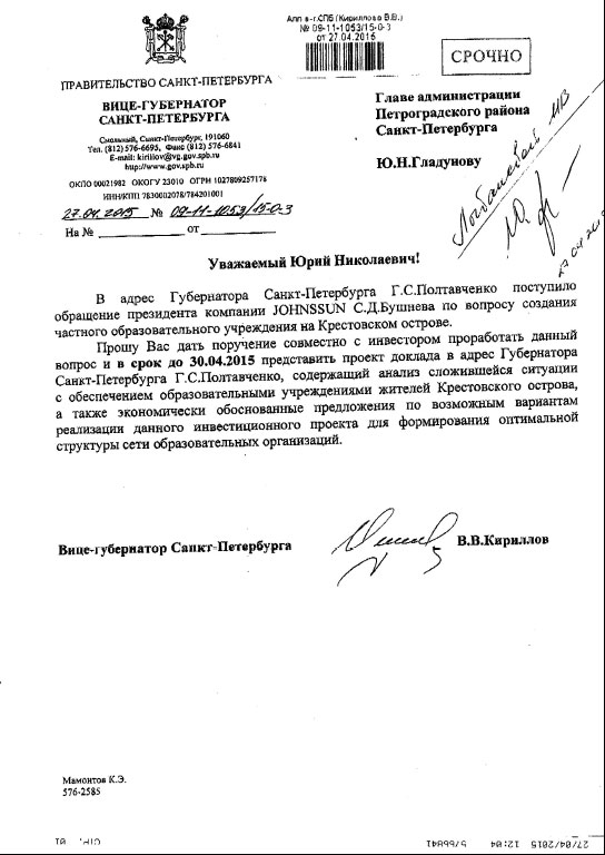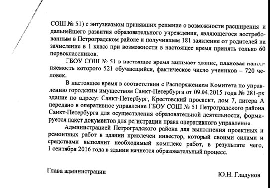 9 апреля Комитет по управлению городским имуществом передал здание на Крестовском проспекте школе № 51 в оперативное управление. Но этим дело не закончилось: к нему подключились советники «образовательного» вице-губернатора Владимира Кириллова, и 27 апреля он направляет главе Петроградского района Юрию Гладунову письмо с очередным поручением «проработать проект совместно с инвестором» и «до 30 апреля представить проект доклада губернатору». Что называется, не мытьем, так катаньем.