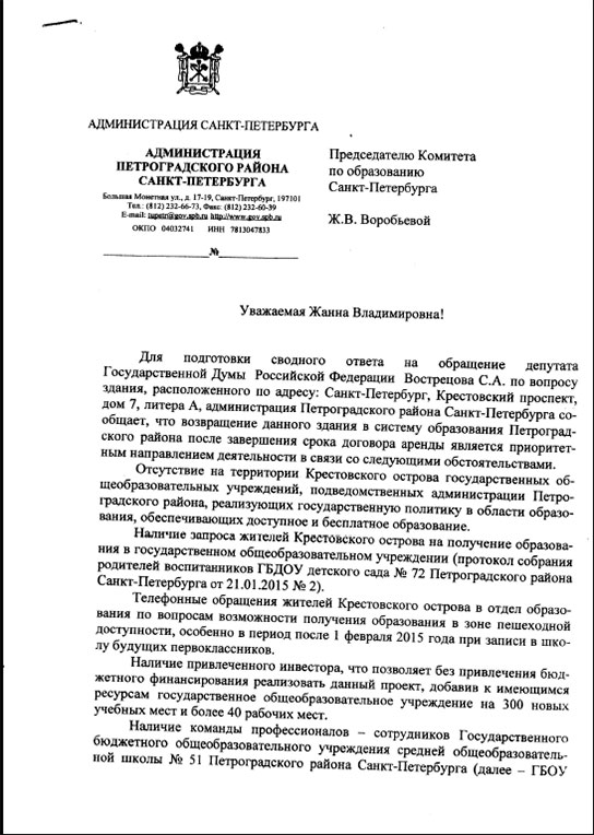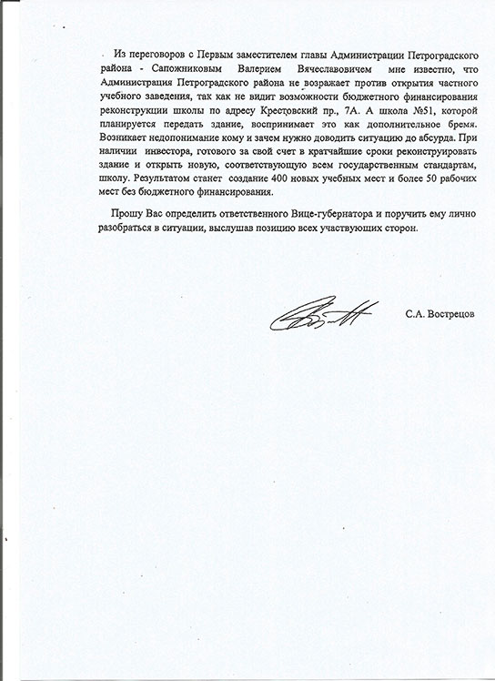 Сергей Вострецов проявляет удивительную заботу о городском бюджете, сообщая губернатору, что «в разгар кризиса бюджет Петербурга испытывает трудности и заинтересован в привлечении частных инвесторов», и что «школа № 51, которой планируется передать здание, воспринимает это как дополнительное бремя» (хотя администрация Петроградского района уже нашла нужные средства, а в 51-й школе вовсе не против расширения, учитывая свою перегрузку)…