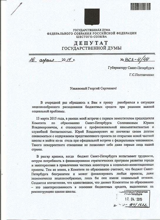 «В рамках моей встречи с первым заместителем председателя Комитета по образованию Соляниковым Юрием Владимировичем я столкнулся с профессиональной некомпетентностью и служебной бестактностью. Юрий Владимирович не посчитал своим долгом … выйти из-за стола при встрече с федеральным чиновником. Такого некорректного отношения не позволяют себе даже первые лица нашей страны».