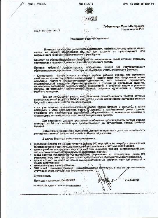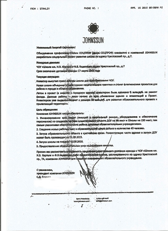 Казалось бы, все логично? И тут на сцене появиляется депутат Вострецов, настойчиво предлагающий создание на Крестовском проспекте, 7 новой частной школы. Инициаторы проекта – американская компания JOHNSSUN и объединение профсоюзов «СОЦПРОФ». В письмах, которые президент компании Станислав Бушнев адресует губернатору Георгию Полтавченко, трогательно рассказывается, что на Крестовском острове проживает «наибольшее количество обеспеченных людей и именно здесь как нигде очень важно появление частного образовательного учреждения, что позволит осуществить индивидуальный подход к обучению учащихся».