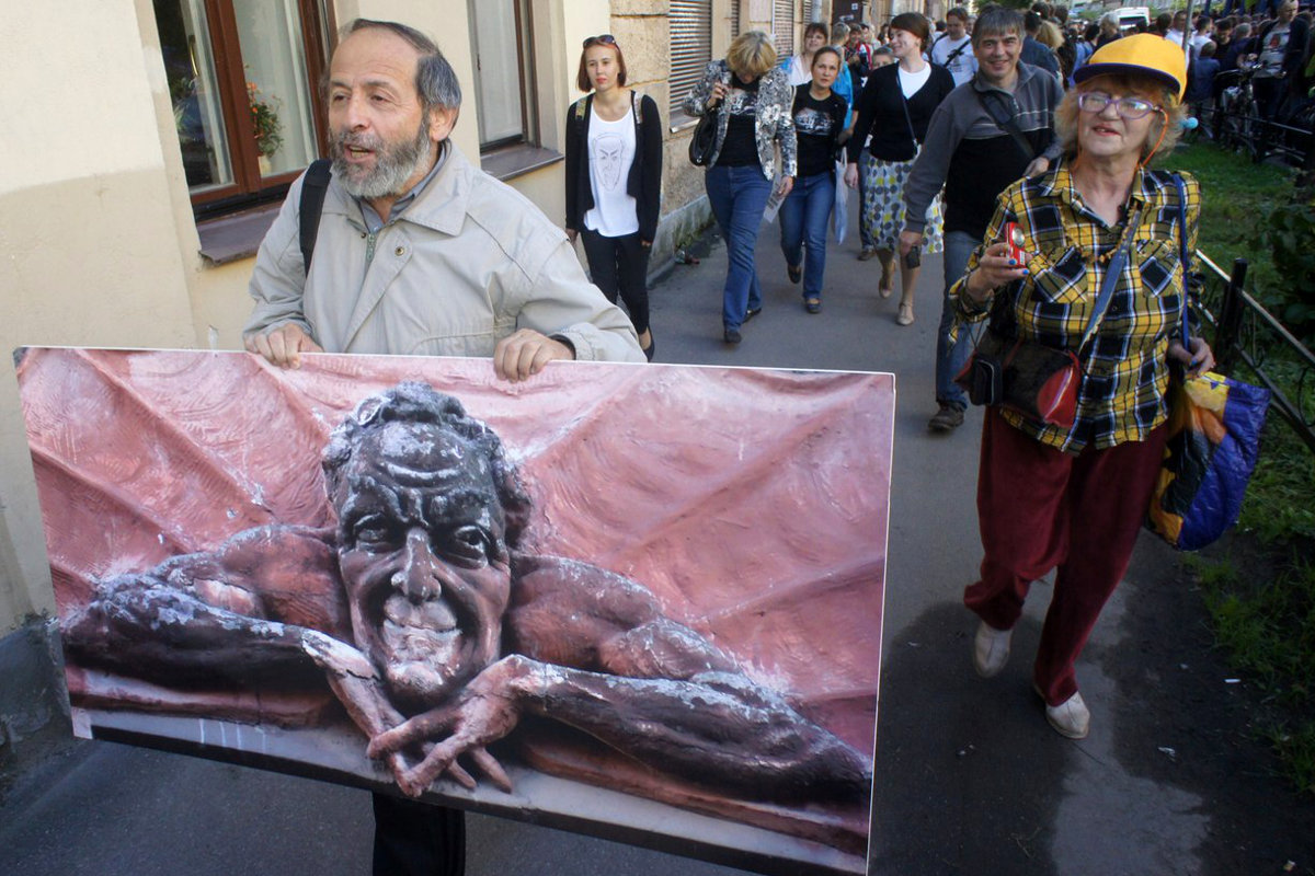 Российский оппозиционер, депутат Законодательного собрания Санкт-Петербурга Борис Вишневский в Петербурге во время акции протеста "Северная Пальмира против вандализма" против сбитого с дома Лишневского барельефа Мефистофеля