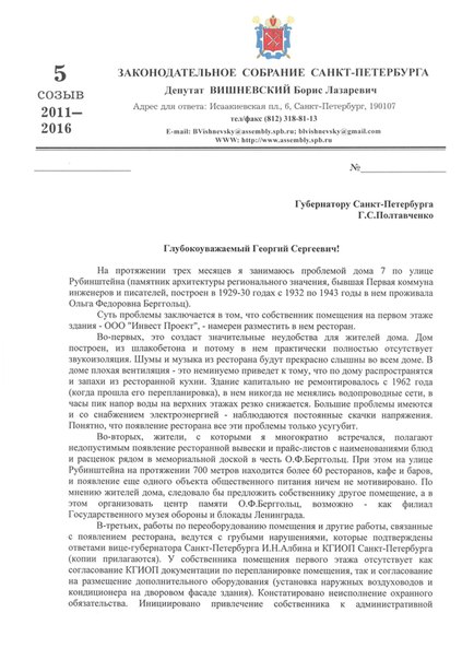 Борис Вишневский просит Георгия Полтавченко пресечь незаконные строительные работы на Рубинштейна, 7