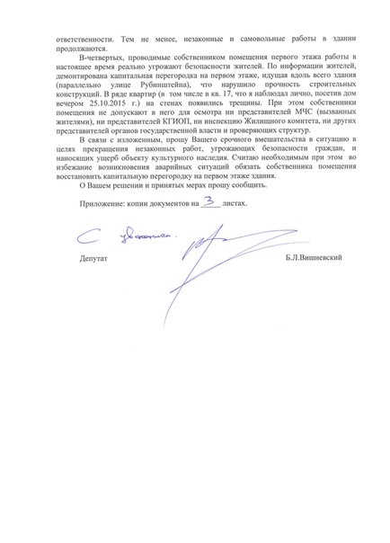 «Противозаконность происходящего очевидна, как очевидна и угроза для безопасности жителей дома, — комментирует ситуацию Борис Вишневский. — Вмешательство губернатора должно помочь. В противном случае встанет вопрос: есть ли в городе вообще власть?»