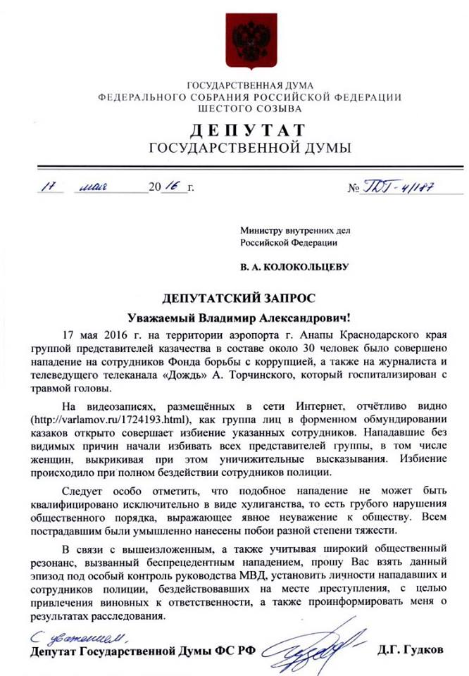 Только что был в МВД. Встречался с первым заместителем министра Александром Горовым: он согласился оперативно принять меня после нападения на сотрудников ФБК в Анапе. Я привез запрос, при мне же заместитель министра наложил резолюцию и приобщил к делу видеозаписи нападения, одну из которых он уже успел посмотреть до моего прихода.