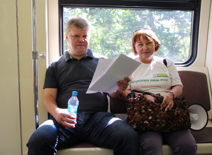 Вообще-то Сергей Митрохин и раньше всегда ездил на метро, если удобнее добраться или – чтобы в пробках не стоять. Но сейчас, во время кампании мы решили в метро еще и поагитировать. Едем группой, в футболках с надписью «Митрохин – наш мэр!», переходим их вагона в вагон вместе с кандидатом.