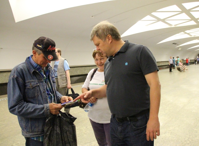 Вчера ездили от Пионерской, где жители начало точечной застройки, до Строгино, где Митрохин остановил две бригады строителей без документов, ведущих застройку и вырубку, и потом – обратно до Новокузнецкой. Сегодня на очереди была желтая линия: от Третьяковской до Новоясеневской, где кандидат встречался с людьми на рынке, вместе с экологами-активистами инспектировал Битцевский парк со всеми безобразиями в связи со строительством сейчас ненужной станции метро – с перспективой появления элитного квартала.