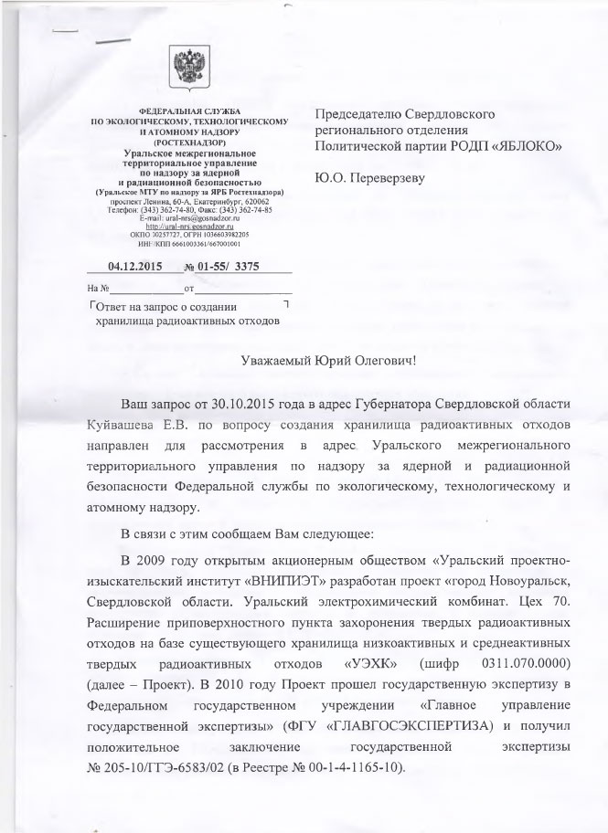 Свердловское ЯБЛОКО получило ответ на запрос губернатору Свердловской области Евгению Куйвашеву о возможном захоронении радиоактивных отходов в области.