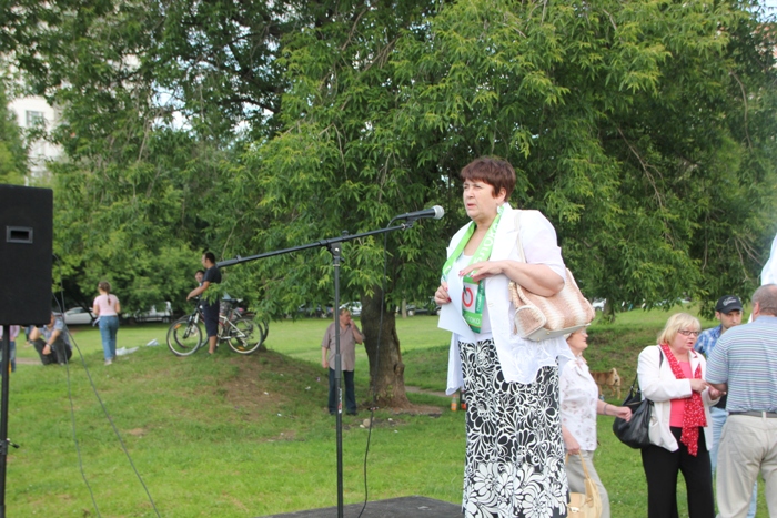 Я всего лишь хочу познакомить вас с содержанием проекта, потому что без специальной подготовки это бывает сложно», - начала свое выступление руководитель Школы активного горожанина партии «ЯБЛОКО» Татьяна Овчаренко. – На месте Волгоградского проспекта будет выстроена эстакада, которая пройдет на уровне второго и третьего этажей и будет упираться в третье транспортное кольцо. Находящиеся по бокам дублеры Волгоградского проспекта будут расширены в сторону домов, и по ним будут идти большие потоки машин, которые не попадут на эстакаду, потому что въезд на нее будет в два раза уже, чем Волгоградский проспект. На Волжском бульваре будет вырублена первая линия деревьев, и машины будут проходить на расстоянии пяти метров от домов. После этого квартиры жителей этих домов будут стоить ноль рублей. При этом особо охраняемая природная территория с деревьями, на которой мы с вами находимся, будет на гектар с лишним вырублена. Жители должны сказать нет этому безумию!».