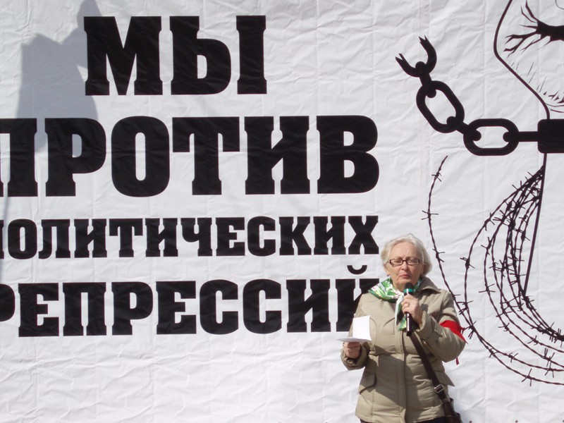 На акции был установлен огромный черно-белый баннер с лаконичной протестной формулой «Мы против политических репрессий». Начался митинг с барабанного боя, как бы создающего общее ощущение тревоги. Но сами выступления были лишены привычного для таких собраний пафоса и содержали неподдельное чувство озабоченности судьбой страны. Читали стихи. Солист рок-группы «Реквием» Юрий Кириллов спел песню Игоря Талькова «Я вернусь». На словах «Спою на первом дне рождения страны, вернувшейся с войны» сломался звук – сел аккумулятор, питающий звукоусилитель. Как будто схватили за горло. Песню допели хором. Как символ освобождения политических узников на волю из клеток выпустили голубей.