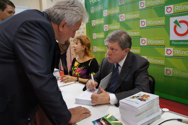 Григорий Явлинский подписывает книгу, слева — Заместитель председателя московского «ЯБЛОКА» Ирина Копкина