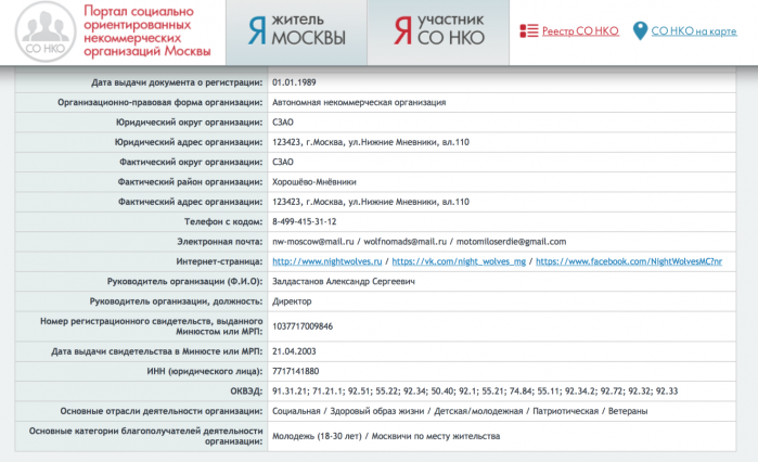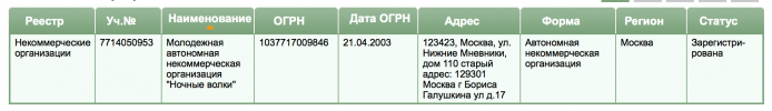 На бумаге это НКО, «молодёжная автономная некоммерческая организация». Вот, например, одна из входящих в структуру «Ночных волков»: