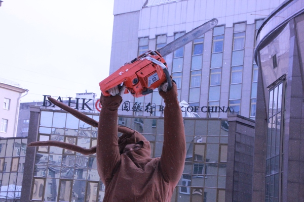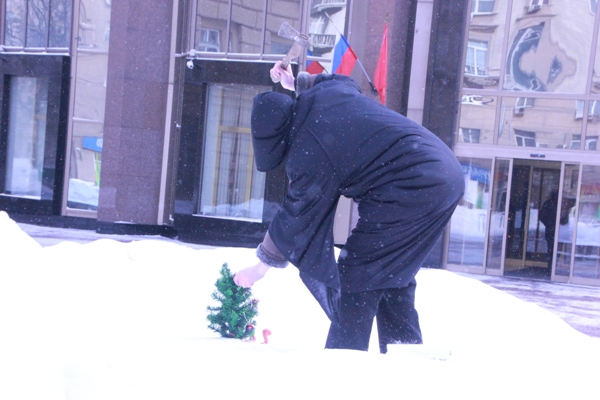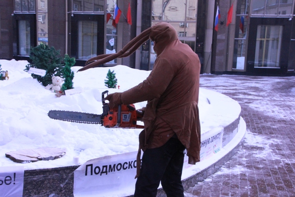 «Елки символизируют леса Подмосковья, жук-короед – коррупцию, – рассказала об акции председатель клинского «ЯБЛОКА» Надежда Самсонова, – В то время пока жук валит деревья бензопилой, министр экологии Московской области А. Шомахов сообщает нам о том, что область заняла первое место по экологии. Жук бросает елки к входу в здание».
