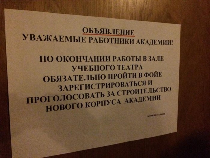 Нас держат в холле. Сергей Митрохин спрашивает граждан, знает ли кто, где здесь находится актовый зал? Ответа нет. Тогда идем сами. По времени слушания уже начались. В коридорах видим интересные объявления на стенах, в которых написано, что сотрудники академии обязаны прийти и зарегистрироваться на «мероприятии».