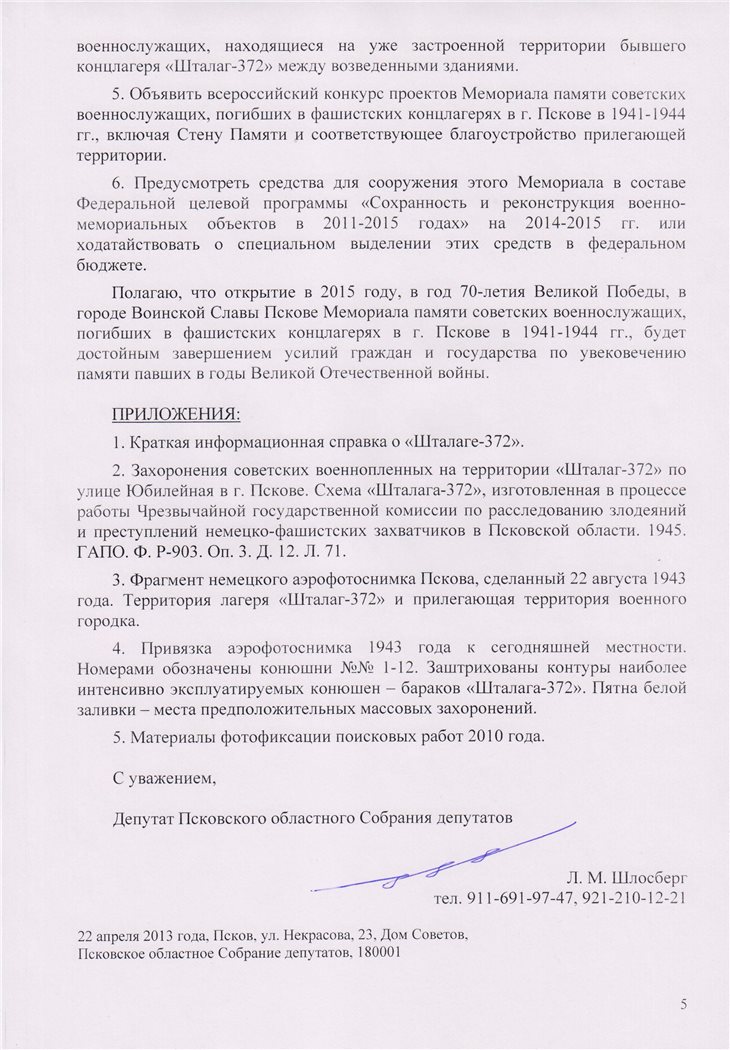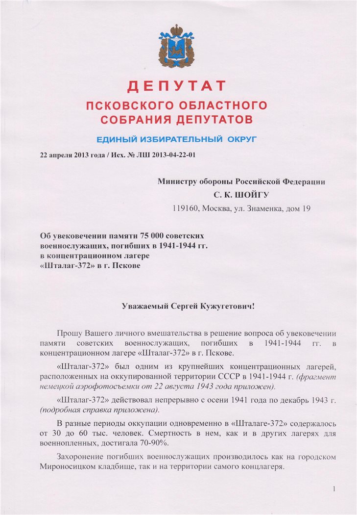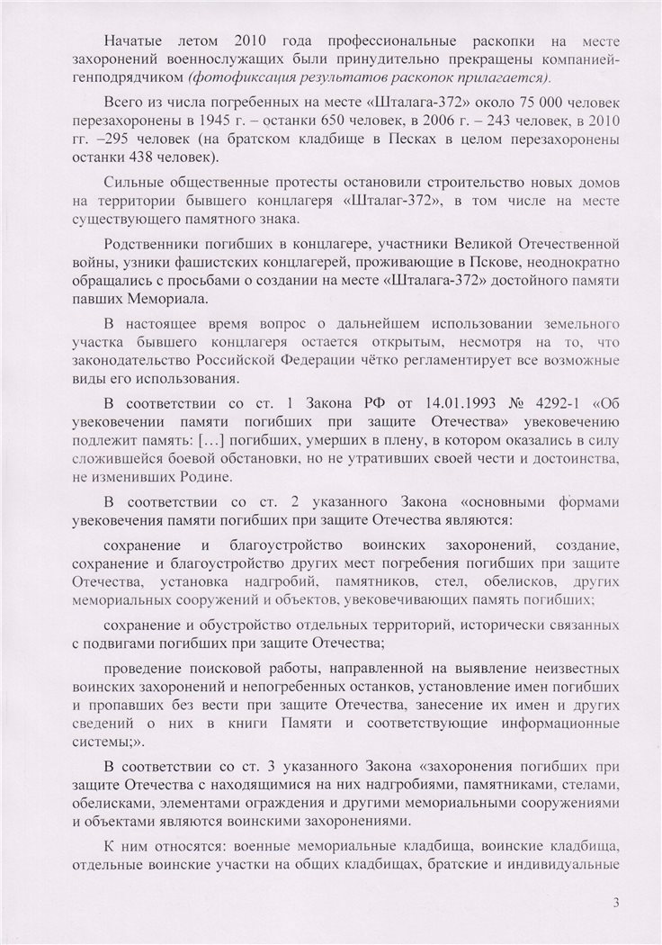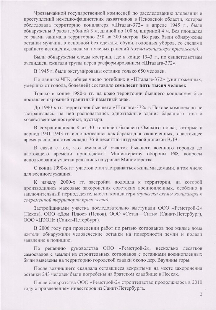 С 2006 года «Псковская губерния» публикует материалы по одной из самых трагических страниц псковской военной истории: строительству жилого квартала на улице Юбилейной в Пскове, на месте расположения одного из самых крупных лагерей для советских военнопленных на Северо-Западе России – «Шталаг-372» [ 1 ]. В 2006 году тревогу подняли местные жители, когда увидели детей, играющих костями. И город заново узнал, что на этом страшном месте трагически оборвалась жизнь, по официальным данным послевоенных советских властей, более 75 (семидесяти пяти) тысяч советских заключенных. Публикации вызвали большой резонанс и отклики. Мы ждали главного резонанса – властей. Сначала показалось, что он будет действенным. Потом стало ясно: производить раскопки останков советских солдат никто всерьез не намерен – ни городские и областные власти, ни компания-застройщик. Демонтажу подлежит и скромный памятник, напоминающий к нему подошедшим, что «здесь, на территории военного городка, в период оккупации Пскова с 1941 по 1944 гг. фашистами было уничтожено в концлагере 75 тысяч советских военнопленных и мирных жителей».