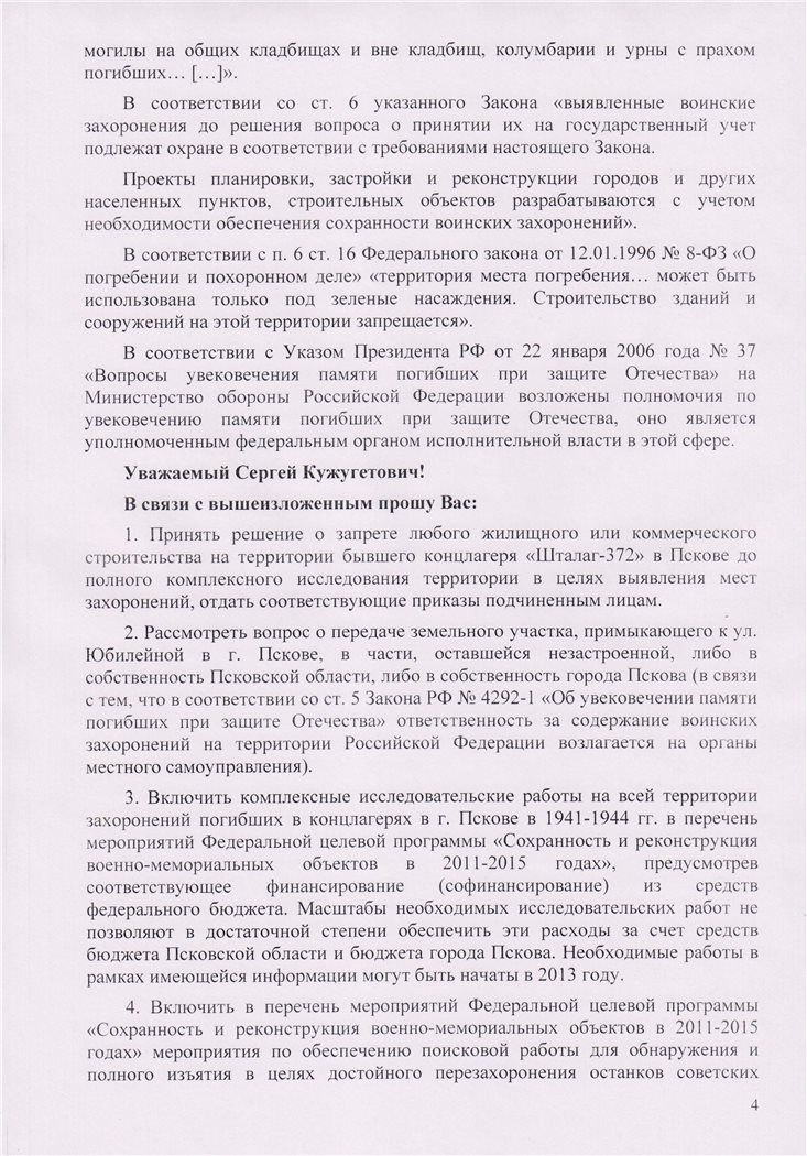 11 апреля мир отметил День освобождения узников фашистских концлагерей. В Пскове по этому поводу прошло торжественное заседание с участием чудом выживших. Но никто из официальных лиц не появился в трагических местах самой памяти – на псковских братских захоронениях погибших в концлагерях – как отмеченных знаками памяти, так и заброшенных. Самое трагическое, до сих пор не устроенное, место в Пскове – место бывшего «Шталага-372» и «Дулага-376», около улицы Юбилейной. Узники помнят о нём. Написано про это место много. Но написанное не привело ни к чему, кроме временной приостановки строительства многоэтажных домов на костях тысяч советских военнопленных. «Главное – достроить дом», – таков оказался девиз чиновников и предпринимателей, но – самое страшное – и многих жильцов, как уже вселившихся в «квартиры повышенной комфортности», так и вложивших в них свои деньги [ 1 ]. Напоминание обществу о трагедии десятков тысяч сограждан остается делом единиц – немногочисленных родственников, нашедших своих родных в списках «Шталага», и псковских добровольцев, попытавшихся – отчаянно и безуспешно – провести раскопки, доказать очевидное и остановить глумление над останками павших [ 2].