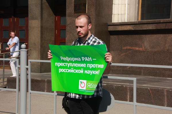 Напомним, серия одиночных пикетов прошла сегодня у Госдумы в 9 часов утра. Пикетчики от «ЯБЛОКА» держали в руках плакат с лозунгом: «Реформа РАН – преступление против российской науки!». Протестовать против реформы пришли около 100 человек.