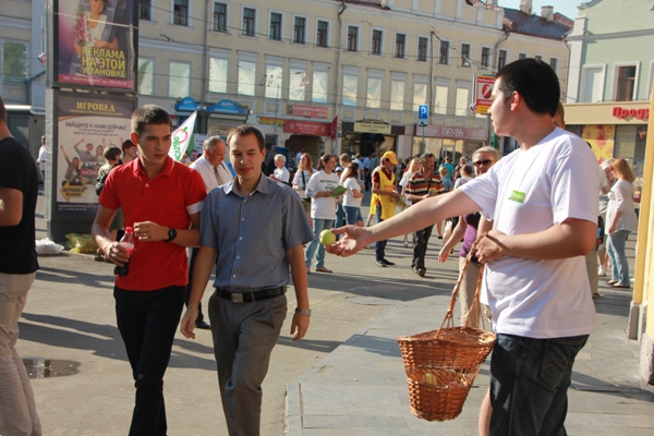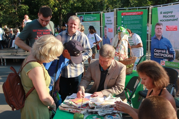 В понедельник, 19 августа, на Яблочный Спас в центре Москвы прошел праздничный митинг-концерт в поддержку кандидата в мэры Москвы от партии «ЯБЛОКО» Сергея Митрохина.