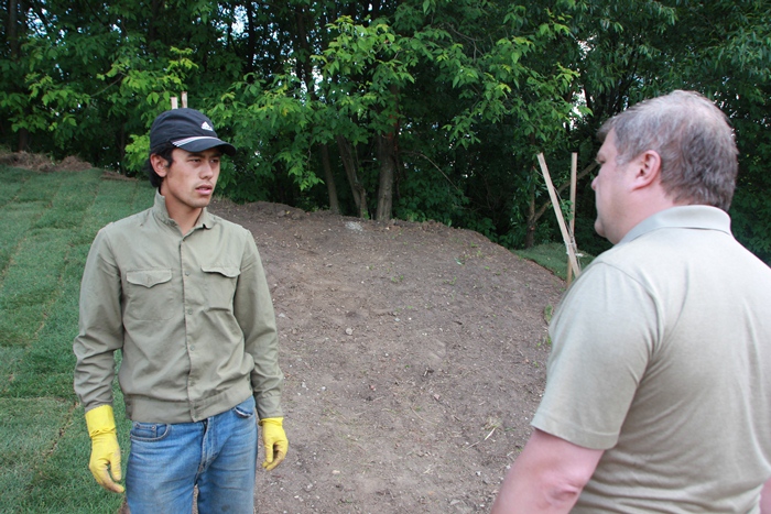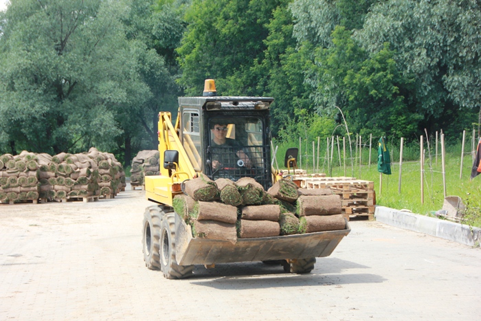 Сергей Митрохин интересуется у рабочих, как будет уложена трава