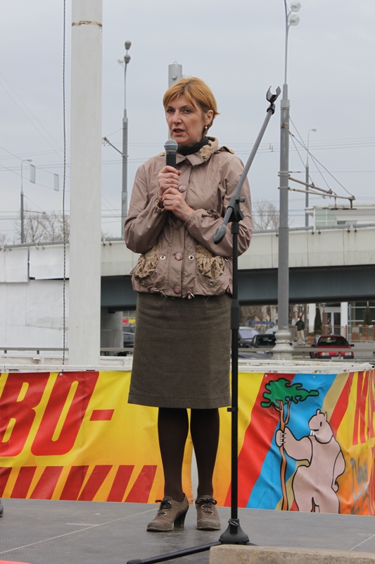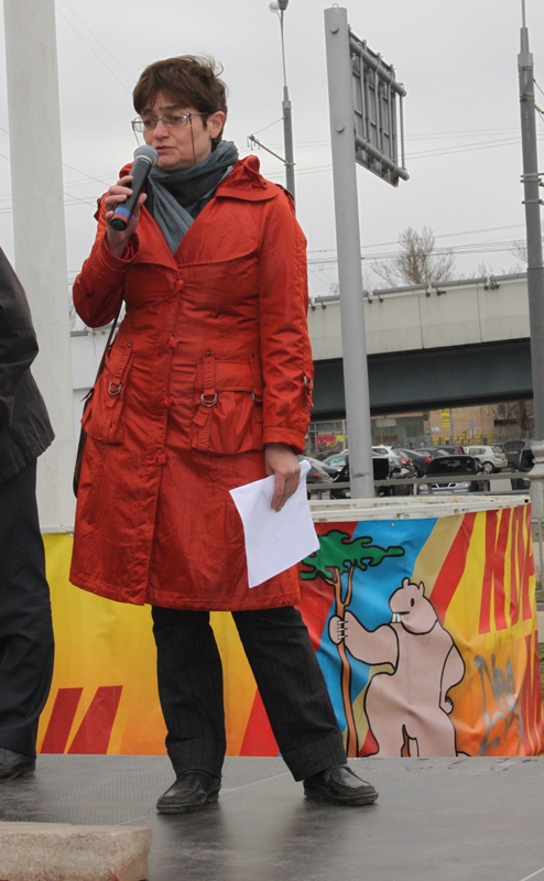 «Мы сегодня собрались здесь, чтобы практически оплакать нашу улицу Народного Ополчения. За эти дни на нашей улице было уничтожено 1,5 тыс. кустарников, 1 тыс. деревьев, 4 га газонов. Наш район превращают в каменную пустыню. Все это строительство стало возможным потому, что жители слишком пассивны. Жители не знали об общественных слушаниях, поэтому не пришли», - возмущается Анна Николаева.