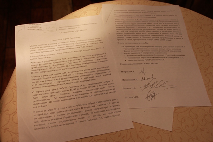 В пятницу, 30 августа, кандидат в мэры Москвы Сергей Митрохин принял участие в заседании Управляющего совета школы № 363, члены которого протестуют против насильственного слияния этого учебного заведения со школой № 1294. Идею провести заседание старого совета председатель «ЯБЛОКА» предложил по итогам проверки объединяемых школ.