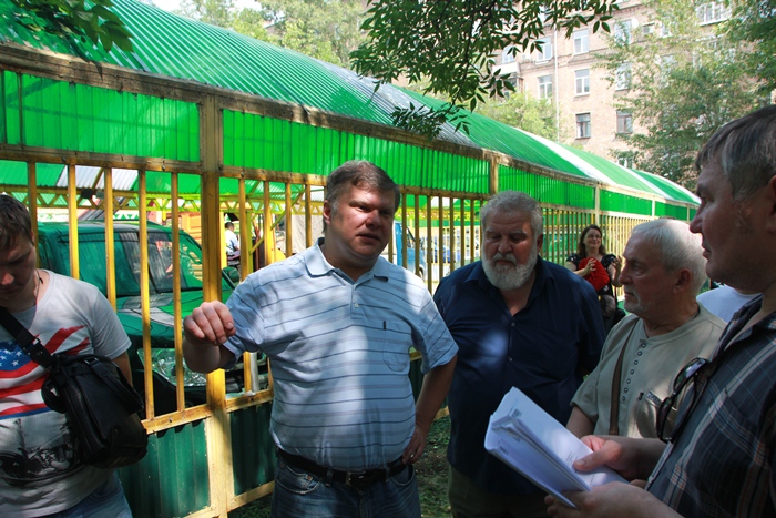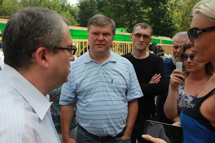 Заместитель префекта ЦАО Кирилл Воронцов рассказывает Сергею Митрохину и местным жителям о достигутом соглашении