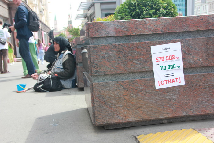 Арифметическая разница: 570 – 110 = откат и т.д. – и была изображена на ценниках из самоклеющейся бумаги. Сергей Митрохин и активисты «ЯБЛОКА» наносили эти ценники на «элементы благоустройства».