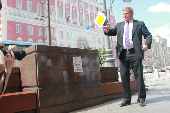 Митрохин приклеил ценники «откатов» на гранитные урны и кадки на Тверской