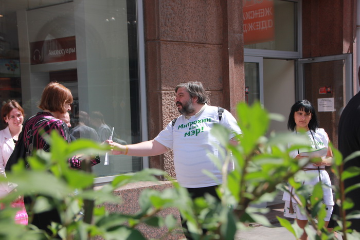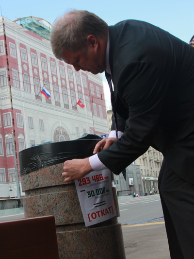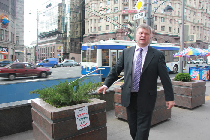 Антикоррупционный центр партии «ЯБЛОКО» Москвы – гранитных урн и комплексов лавочек с кадками для деревьев на общую сумму в полмиллиарда рублей. Лидер «ЯБЛОКА» Сергей Митрохин еще в понедельник обратился в СКР и прокуратуру с требованием возбудить уголовное дело в отношении коррумпированных чиновников мэрии, но решил на этом не останавливаться, и сегодня перед торжественной церемонией вручения удостоверения кандидата в мэры прошел по Тверской и показал журналистам и прохожим, во сколько обошлось городу озеленение по-собянински.
