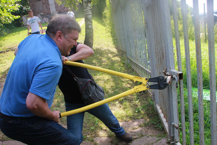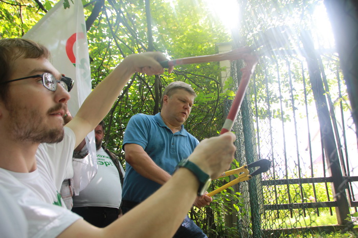 На обратном пути Сергей Митрохин с помощью больших кусачек открыл калитку в заборе, отделяющем доступную жителями часть парка от захваченной чиновниками.