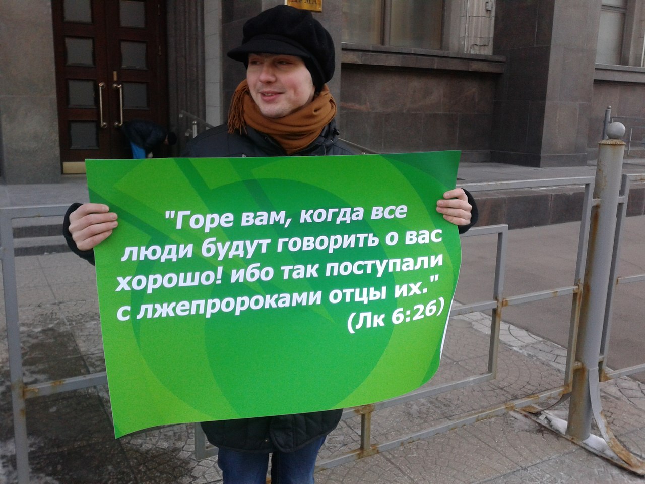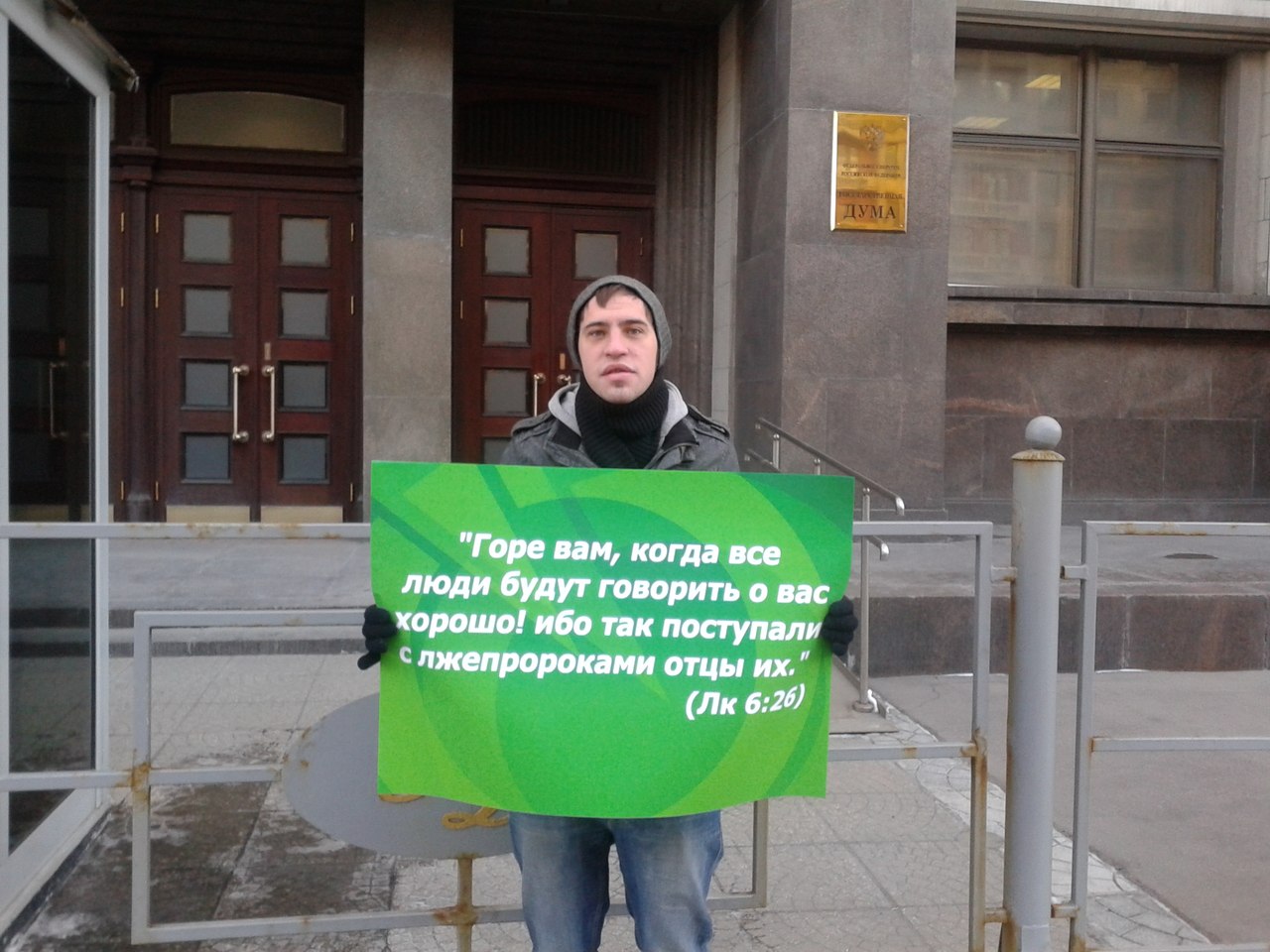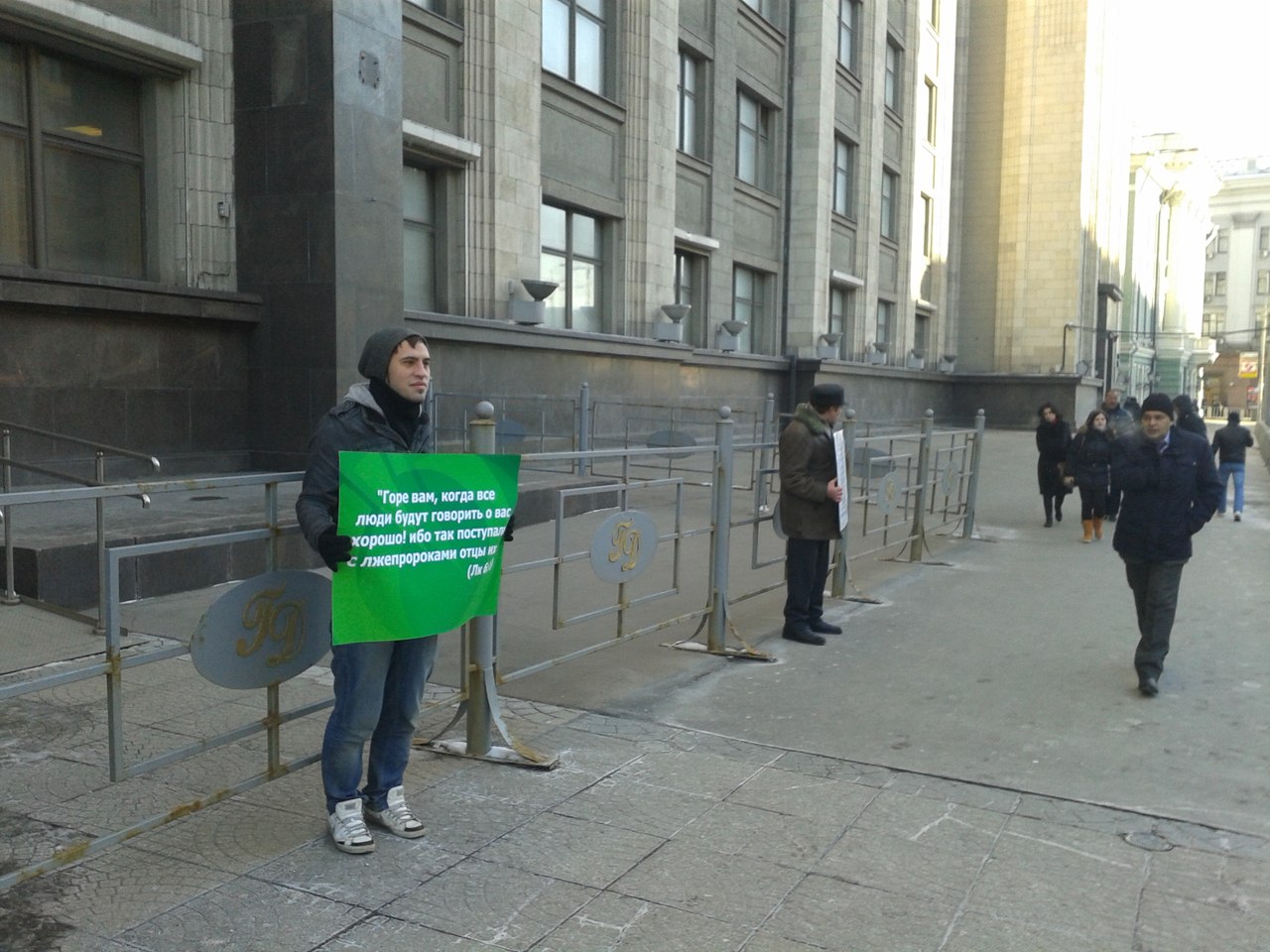 Сегодня, 22 марта, Государственная Дума рассматривала в первом чтении законопроект об оскорблении чувств верующих. «Молодежное ЯБЛОКО» выступило категорически против этой инициативы, проведя серию одиночных пикетов у здания парламента.