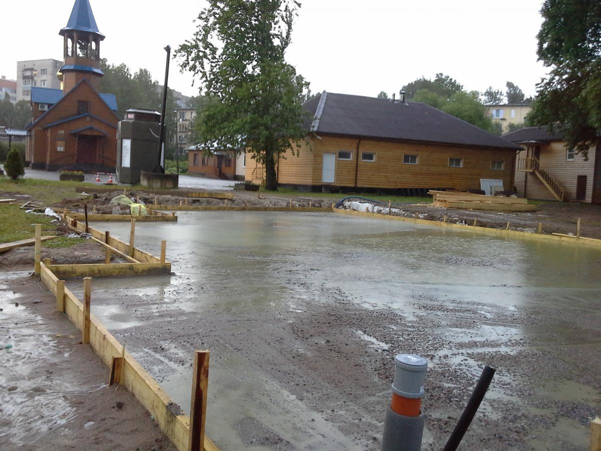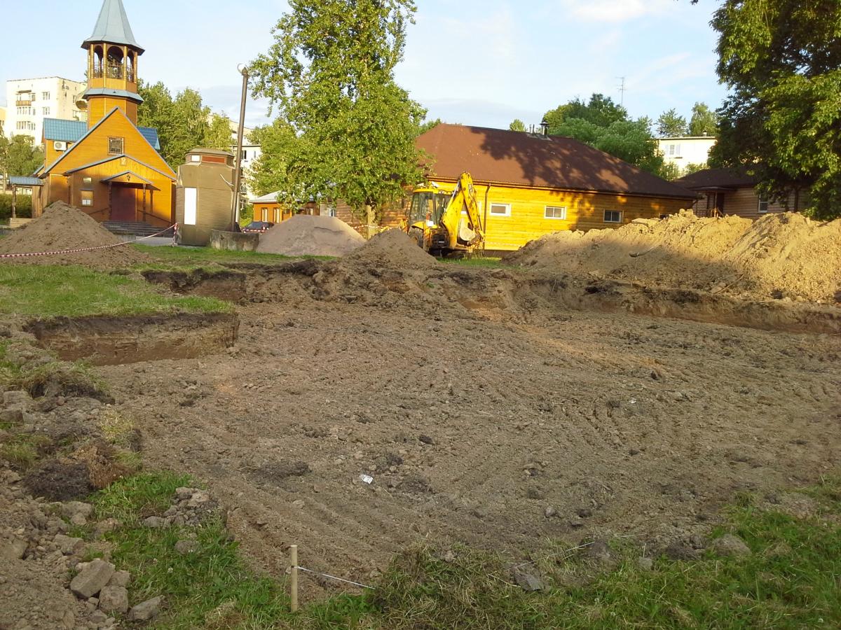 В течение последних двух недель здесь был вырыт котлован, залит фундамент и проведены подготовительные работы по подключению к сетям строящегося здания, предположительно, воскресной школы.
