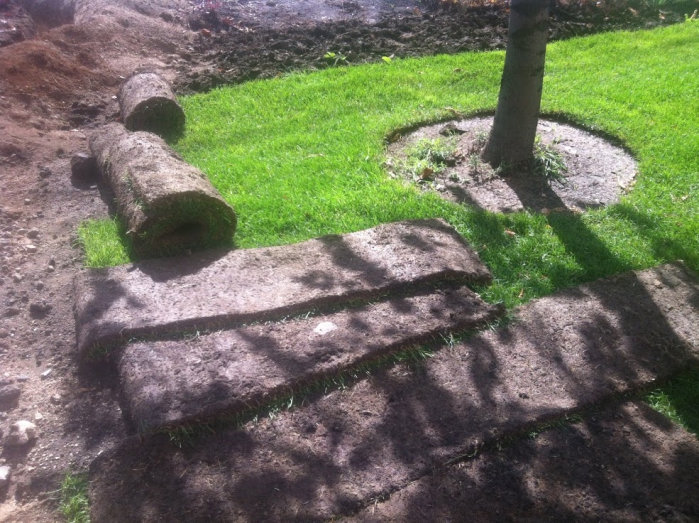 Вы видите, что только уложенный газон далеко не свеж. Что с ним будет на следующий сезон? Судя по всему, уложен газон неправильно. Если под полотном щели, трава быстро высыхает, как на фото. Спрашивается, чего ради стелить газон, который едва ли переживёт пару зим или сразу увянет?