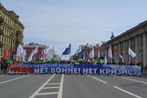 Во главе первой колонны марша — депутаты Законодательного Собрания Борис Вишневский и Александр Кобринский и председатель Петербургского «ЯБЛОКА» Андрей Палевич. На первом баннере — главный лозунг «Нет войне! Нет кризису!».