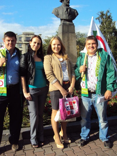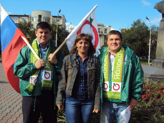 Кандидаты в депутаты: Руслан Руденко (справа), Анастасия Останина (в центре) и активисты городского отделения партиии "ЯБЛОКО"