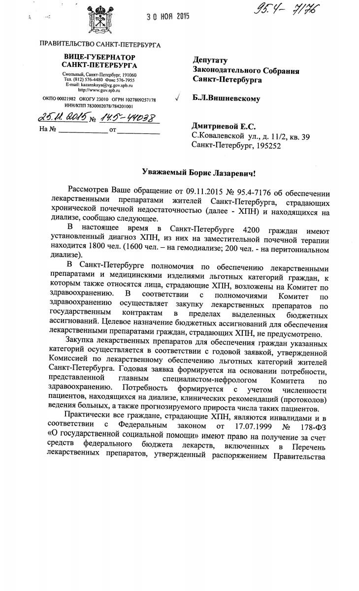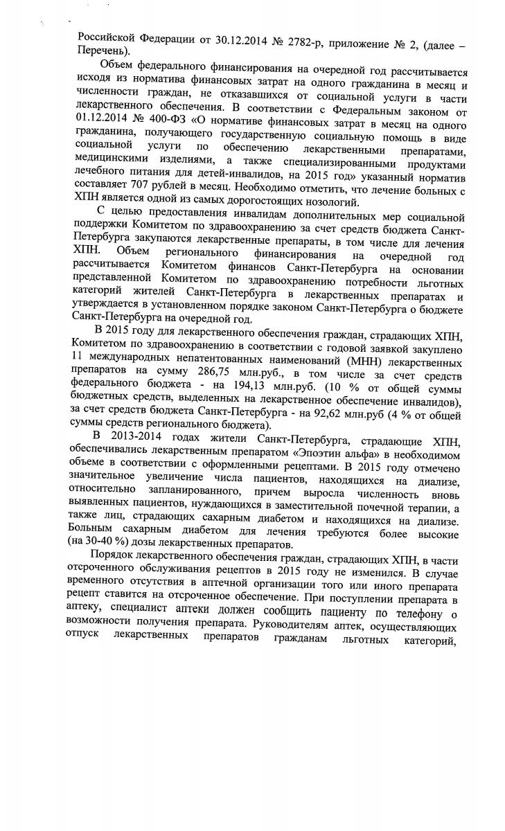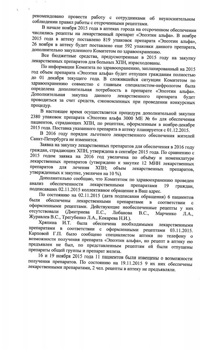 Из ответа вице-губернатора Казанской видно, что ситуация с обеспечением горожан льготными медикаментами в 2015 году крайне трудная. Все бюджетные средства, предусмотренные на закупку лекарств для больных ХПН, оказались израсходованы уже к декабрю.